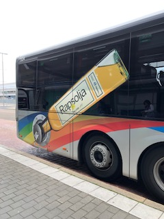 市内へ向かうバスには大きな菜種油のビンが描かれている